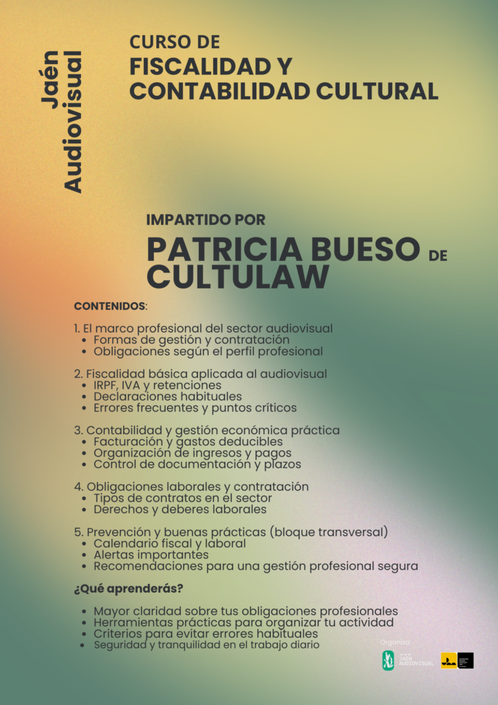 De la mano de Patricia Bueso (Cultulaw), abordaremos de forma clara y práctica las principales obligaciones fiscales, laborales y contables que afectan a creadoras/es y profesionales del audiovisual.
