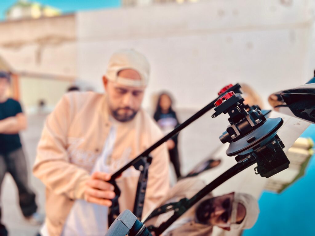 Alberto Pardo, técnico audiovisual y productor con experiencia como maquinista en el departamento de iluminación, ha aportado una visión técnica centrada en la operativa de set. Especializado en sistemas de fijación y movilidad de cámara, ha trabajado con el sistema de anclaje por ventosas Tilta Hydra Alien, así como con travellings y grúas, abordando montaje, equilibrado, seguridad y resolución de incidencias reales. Ha participado en cortometrajes como ‘Ganadero’ y ‘En el nombre del arte’, y en el videoclip ‘Perro Hambriento’.